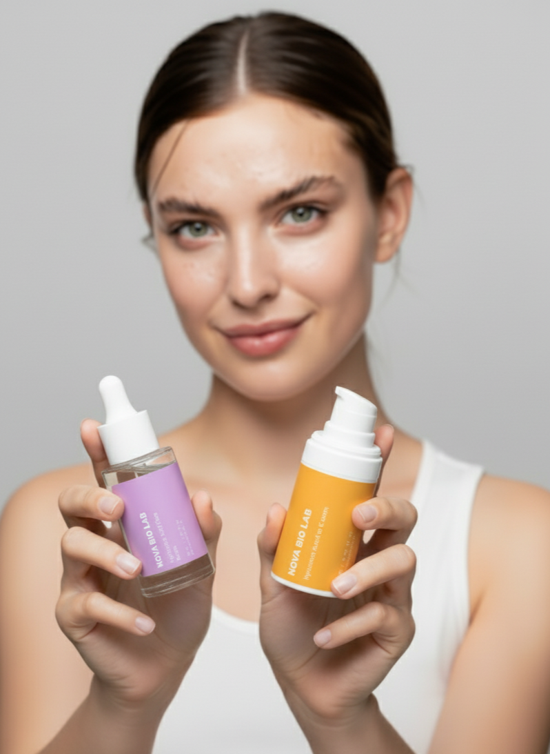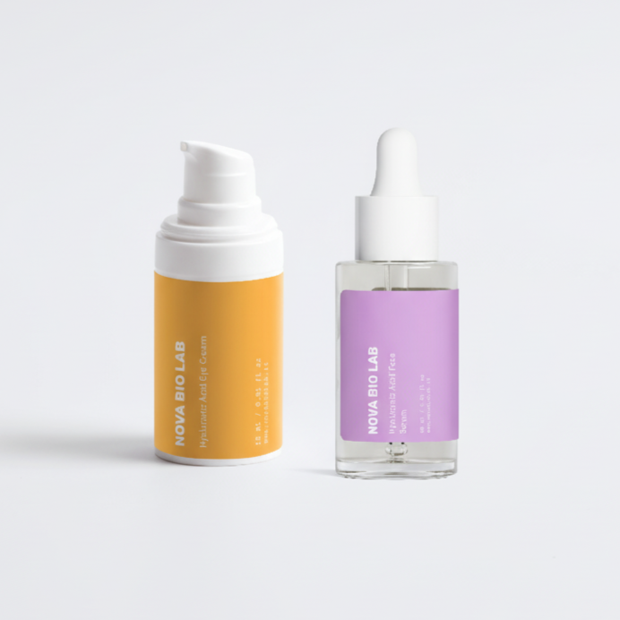 Il kit anti-età completo: Siero Viso all'Acido Ialuronico (30ml) che combatte rughe e perdita di tono + Crema Contorno Occhi Anti-Età (15ml) che riduce occhiaie, borse e zampe di gallina.